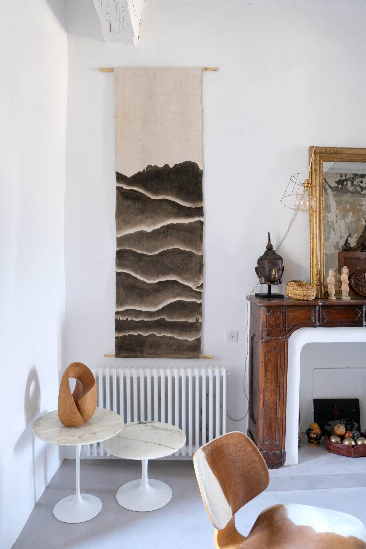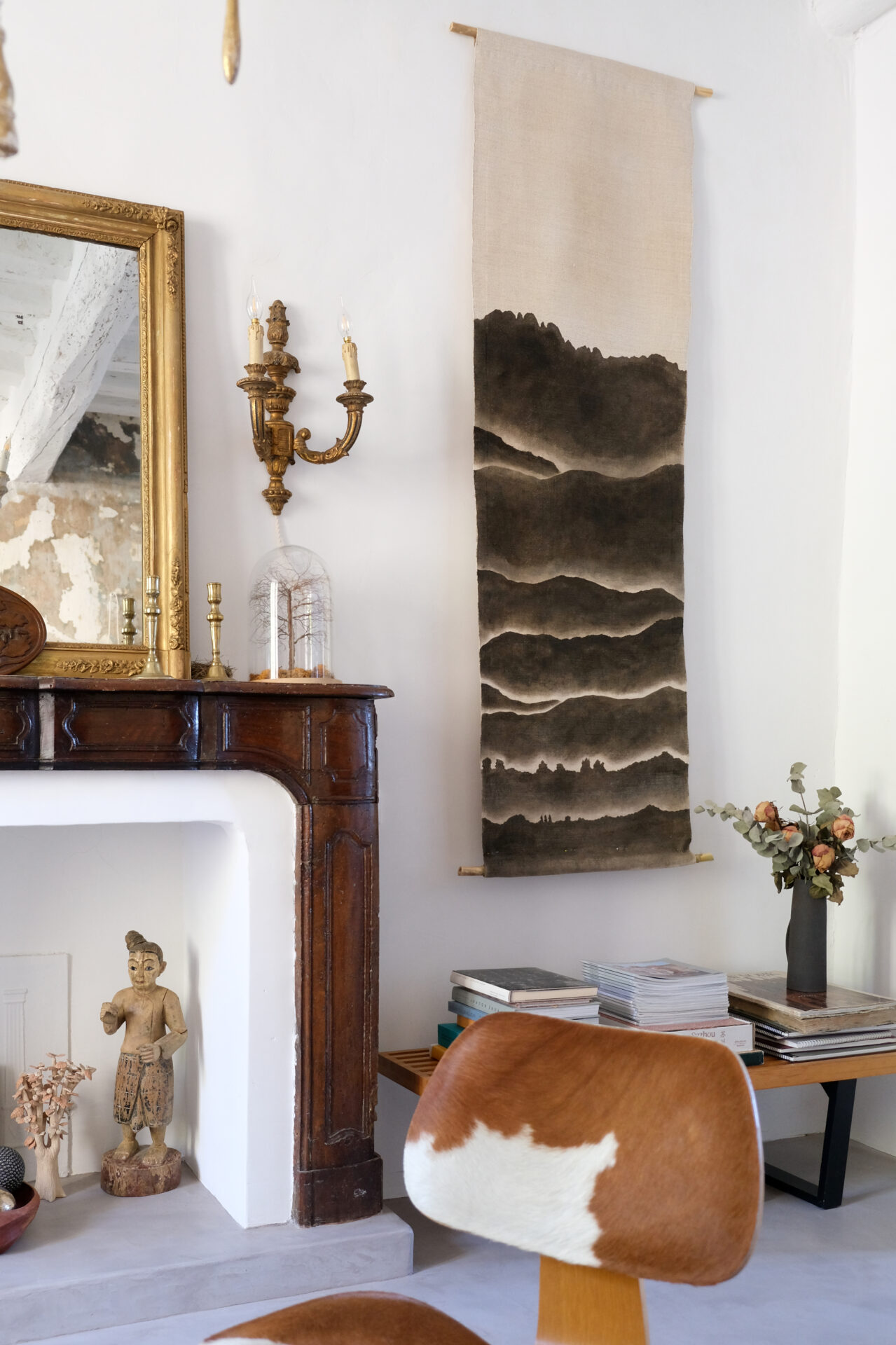 The pattern is freely inspired from the dentelles de Montmirail on which the house stands. It continues from one panel to the next, on each side of the fireplace.