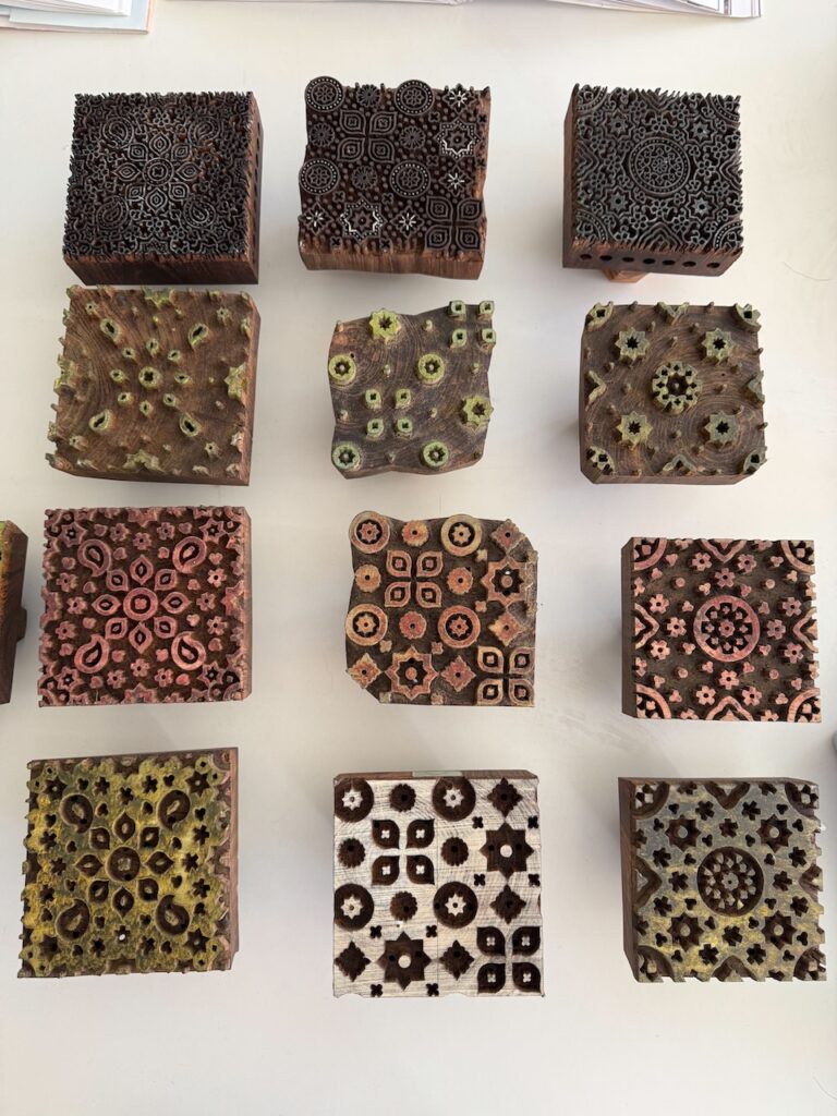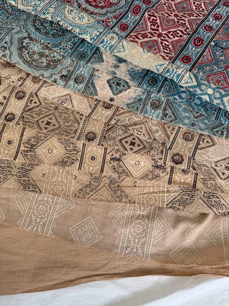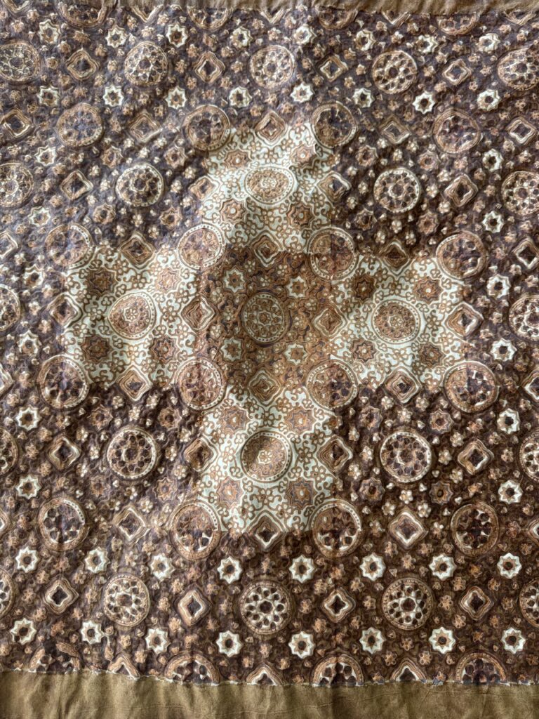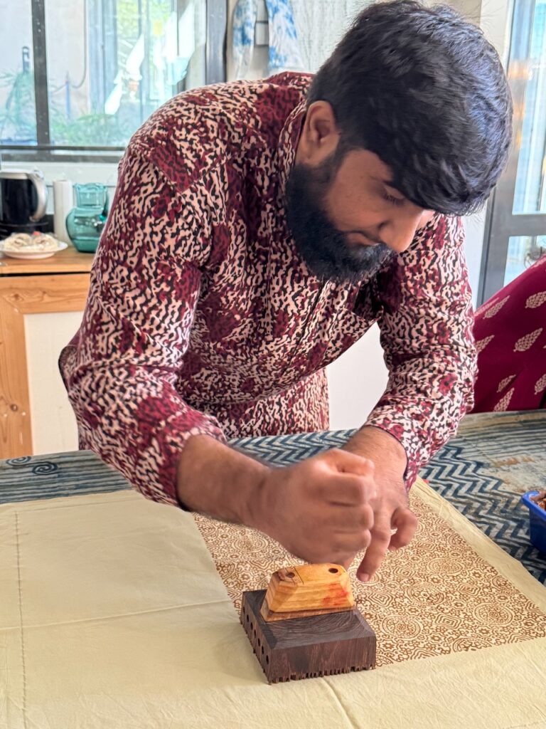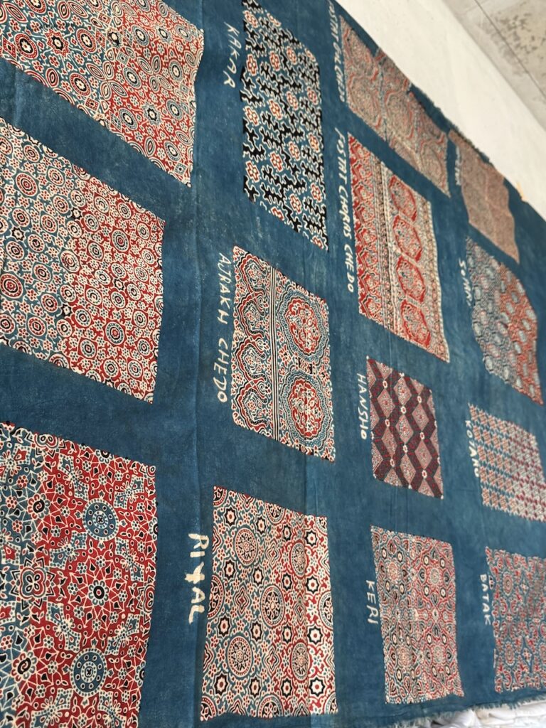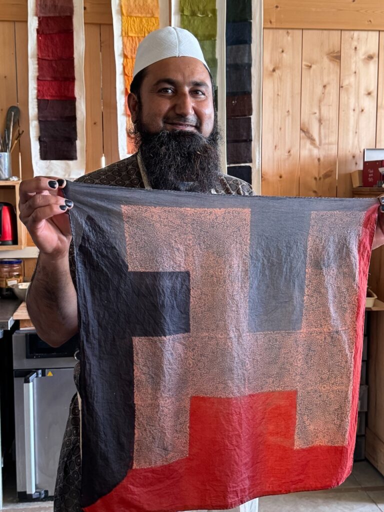 A real honour and pleasure to learn a centuries old craft from Master Sufiyan Khatri who caries his art from several generations of masters in Ajrakh printing. Along with his son and Parmeet Kaur Tesson, they tought us the steps and the concepts. While Block printing is an age old art in many part of India, the technique of Ajrakh printing differs from others by applying resist pastes and dying in vats instead of direct printing.