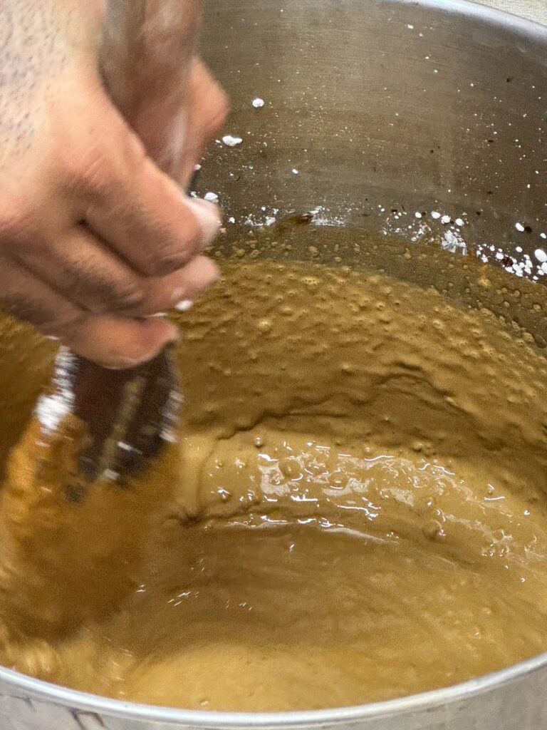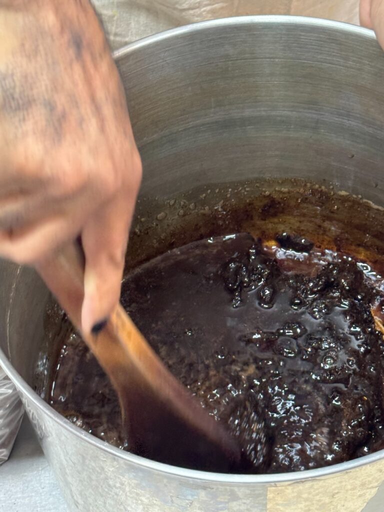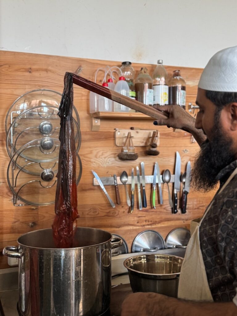The technique involves three passages of blocks printing the same area inserted one into each other. Just as if that wasn’t hard enough, the traditional cloths are printed on both sides. This all seems literally impossible to do, until you watch master Sufiyan and his son do it with a surreal ease!! Every block has a different resist paste: simple resist for the outline, resist with alun for the second colour, iron for the black outline.