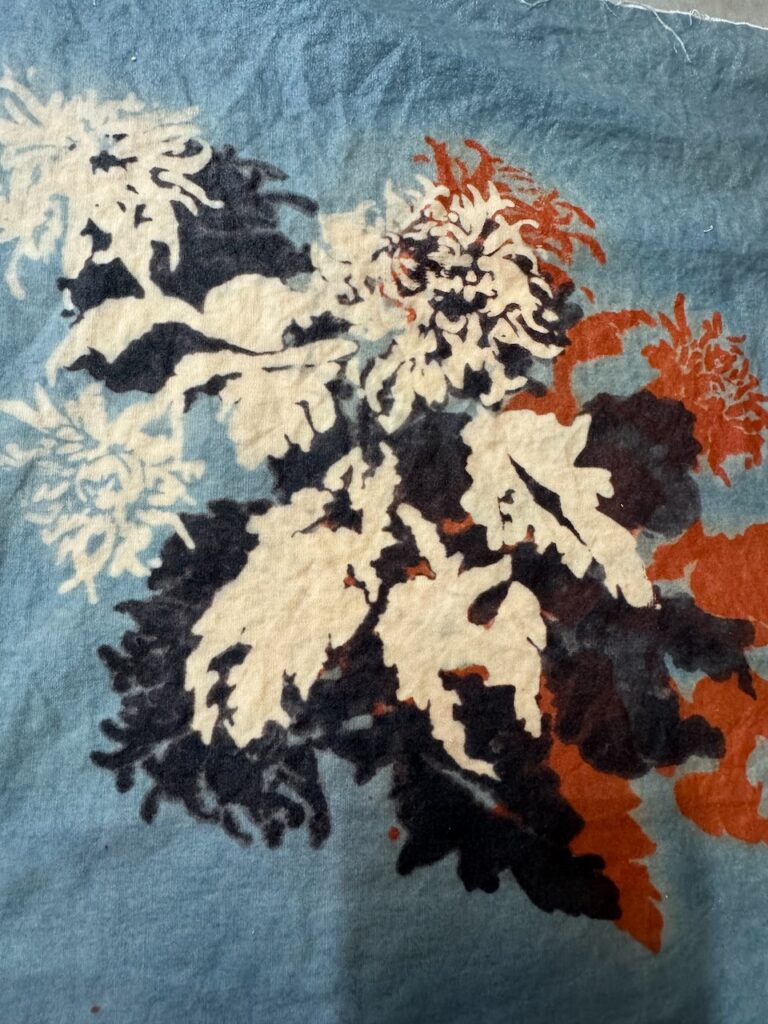 A first passage in the indigo vat, followed by another in a different colour and a final rinse reveals the final result: a patterned cloth with four different colours, the original from the cloth, blue, red (for the traditional cloths), and black. When you have practised vat colouring, this is akin to magic!