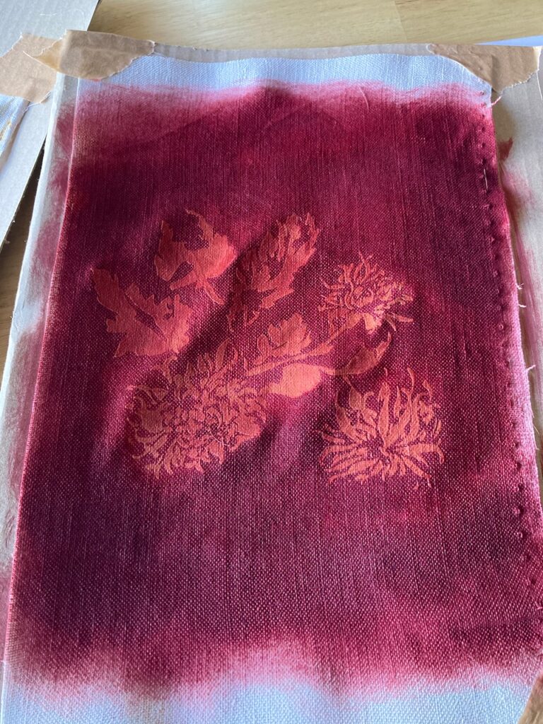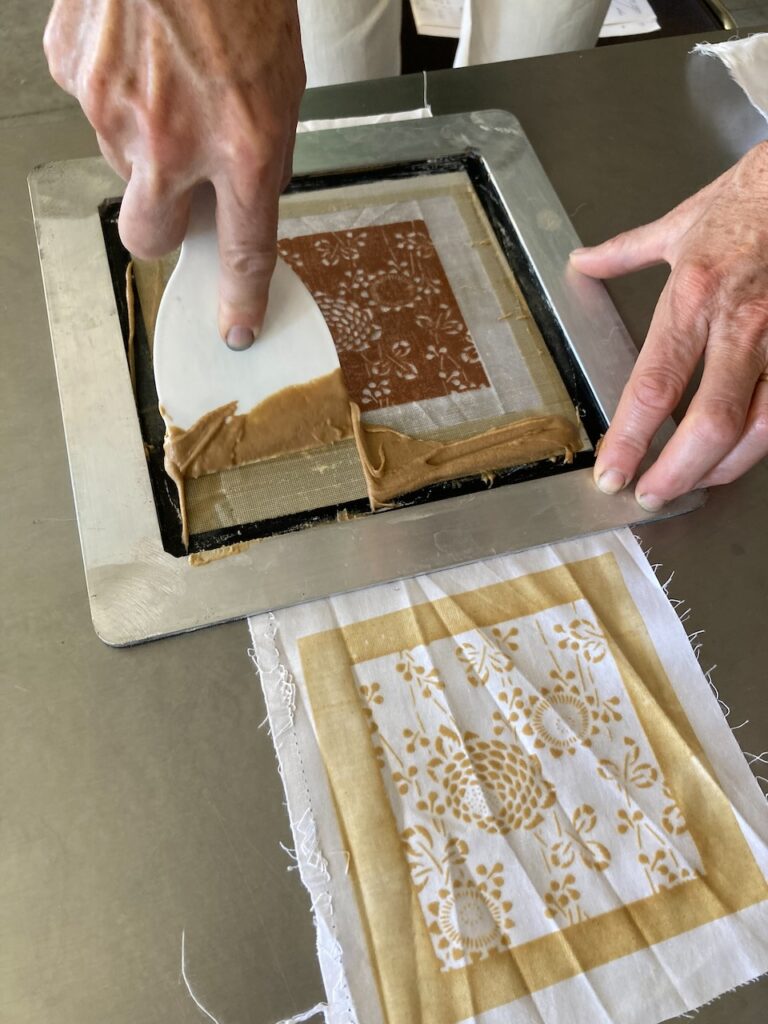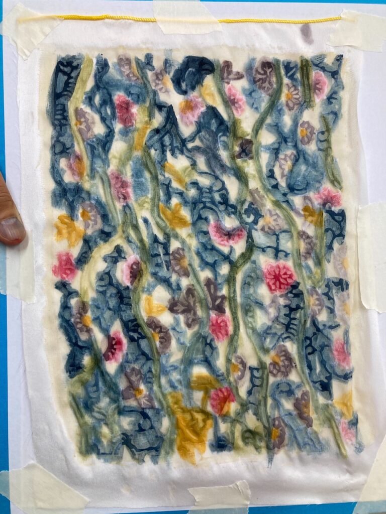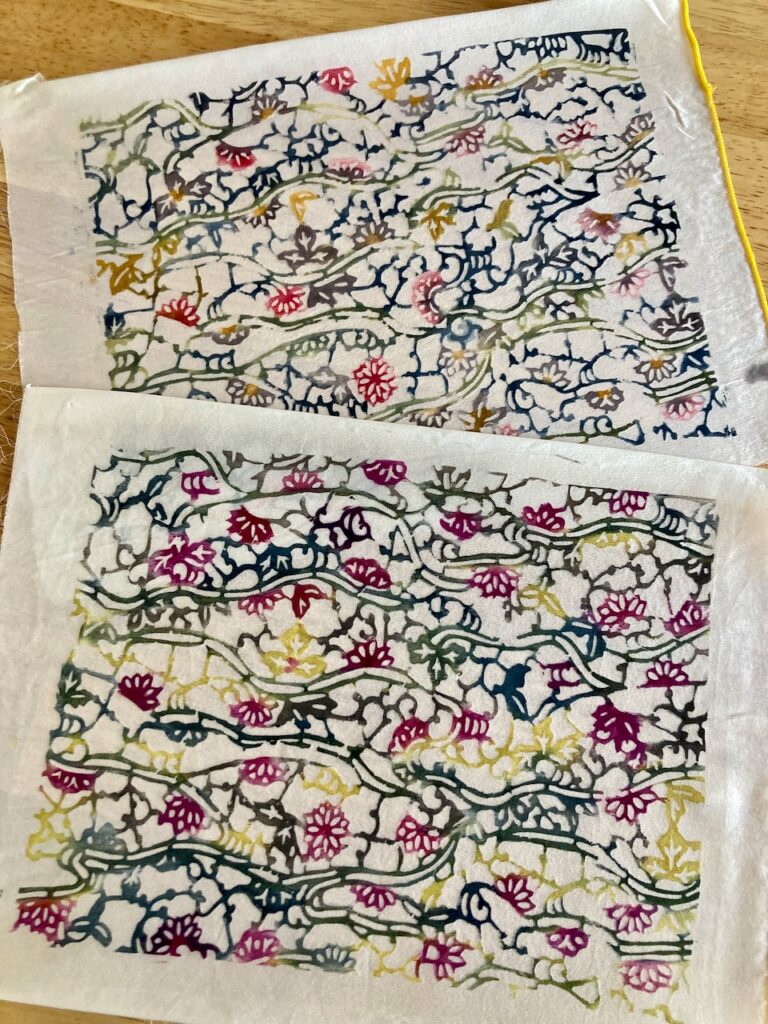 Bingata is a Japanese technique that combines resist with a rice paste and direct printing with plant or mineral based colours.