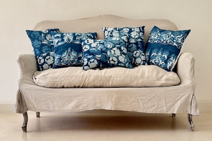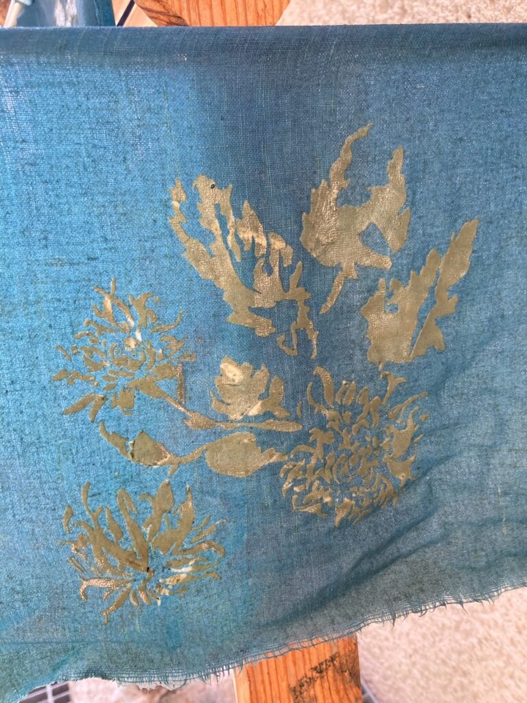 Norizome is a Japanese technique that uses resist with a rice paste and indigo dye in a vat. When done repetitively, the result is an awesome degrade of blues